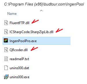 All required dependency files are part of the installation package, and copied to the program folder during installation (which defaults to C:\Program Files (x86)\budtour.com\IngenPool\). If some DLL files were not installed, or somehow got deleted by mistake, we recommend downloading our most recent package ipool400.zip , and do a full re-install. *** DO NOT UNINSTALL!!! *** (or existing data may be deleted), just make sure Ingenpool is shut down before running the new install package. If the installation is successful, the previously missing file will now exist in the installation folder. Otherwise, you may not have permission to install software on that PC. You may try to right-click the installation shortcut and run again "as administrator".